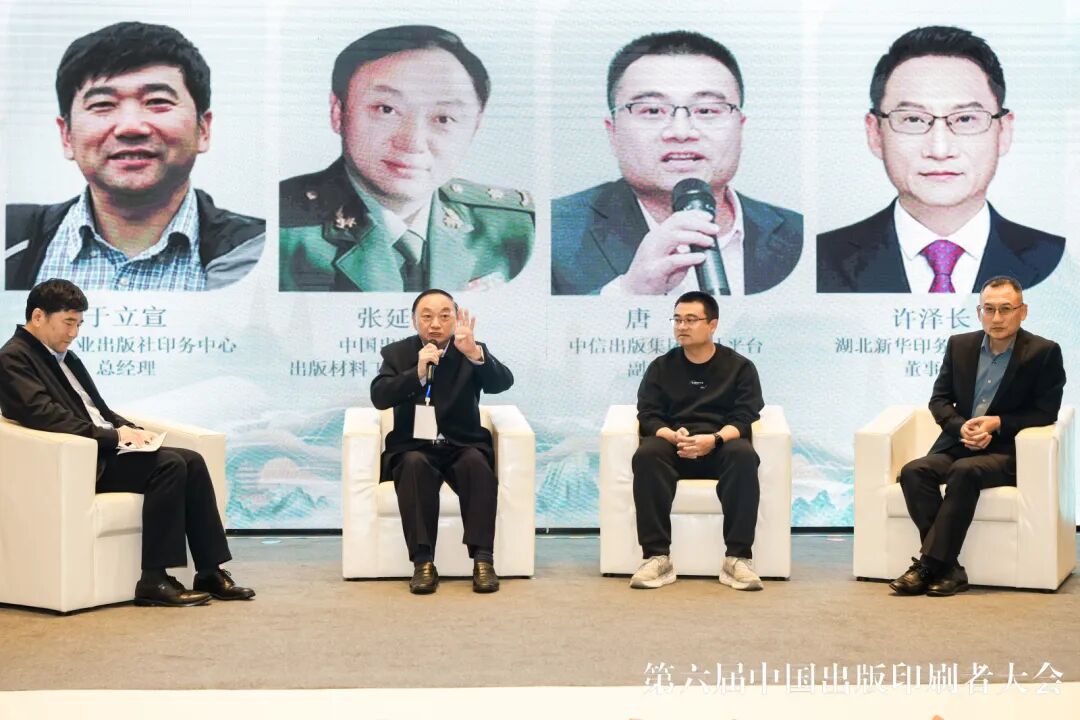 对话嘉宾:中国出版协会出版材料工作委员会主任张延扬(左二);中信出版集团出品平台副总经理唐果(右二);湖北新华印务有限公司董事长许泽长(右一)